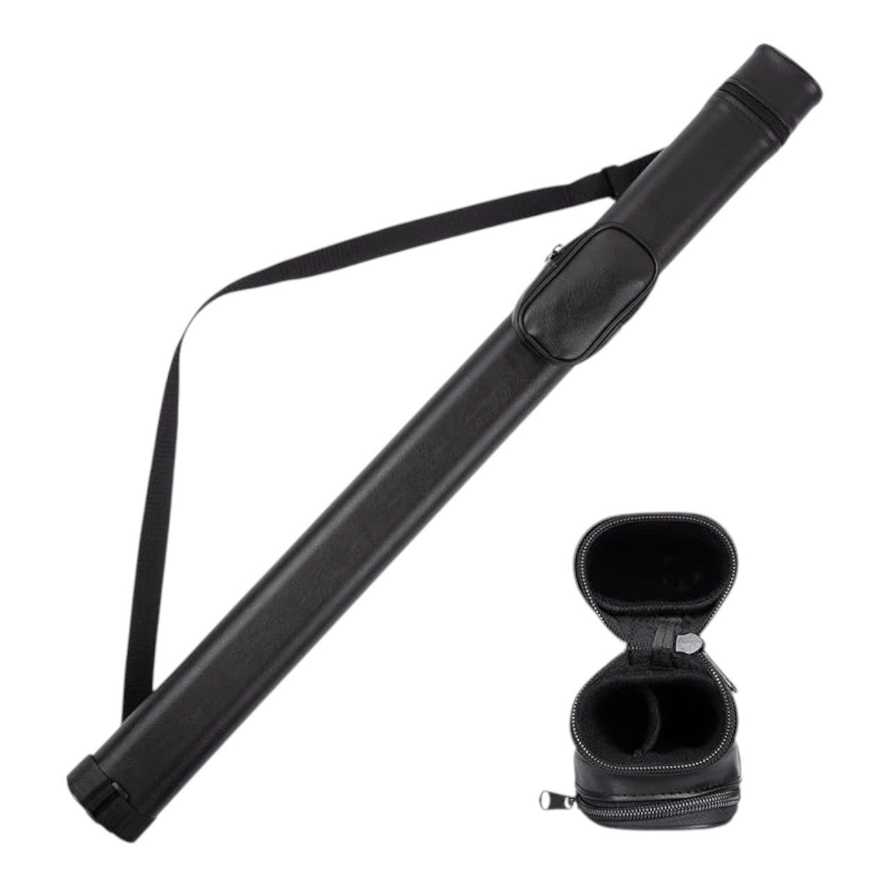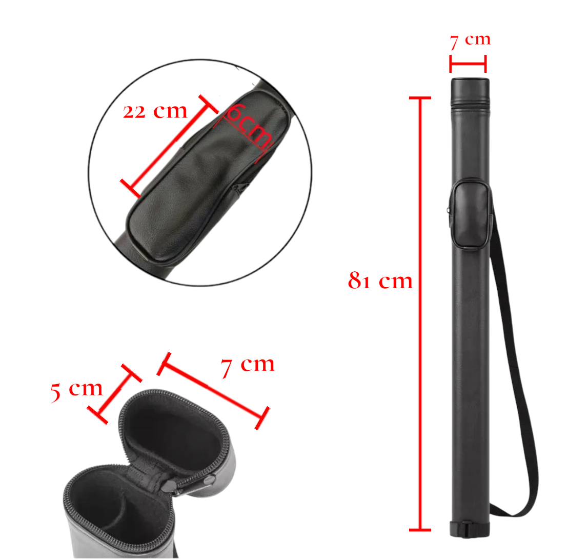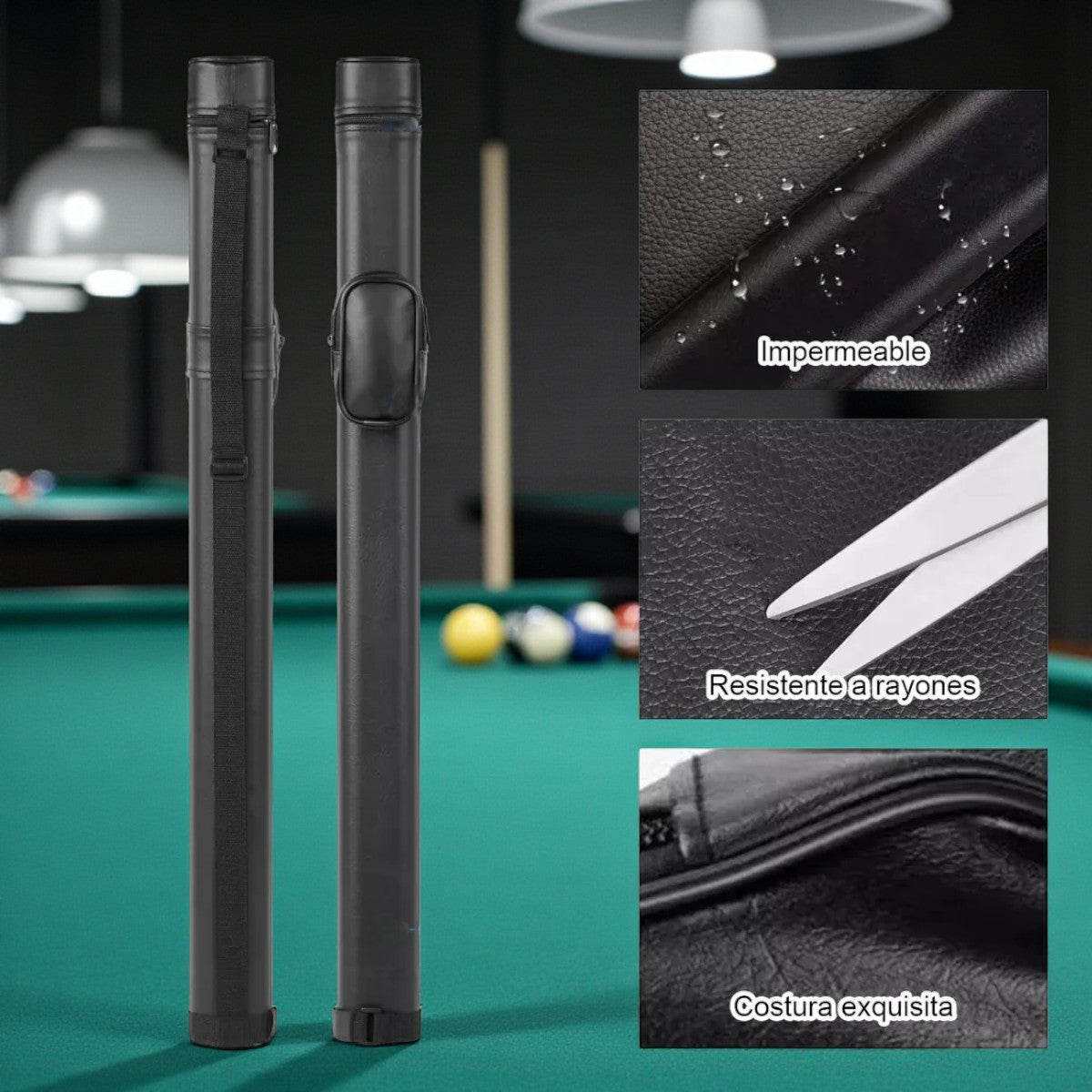 - Material: imitación piel cuero, impermeable y resistente a rayones - Color: negro elegante - Medidas: 81 cm de alto × 7 cm de ancho - 2 compartimentos internos (uno para cada pieza del taco) - Bolsa ajustable para accesorios o tizas - Fácil de transportar y muy duradero