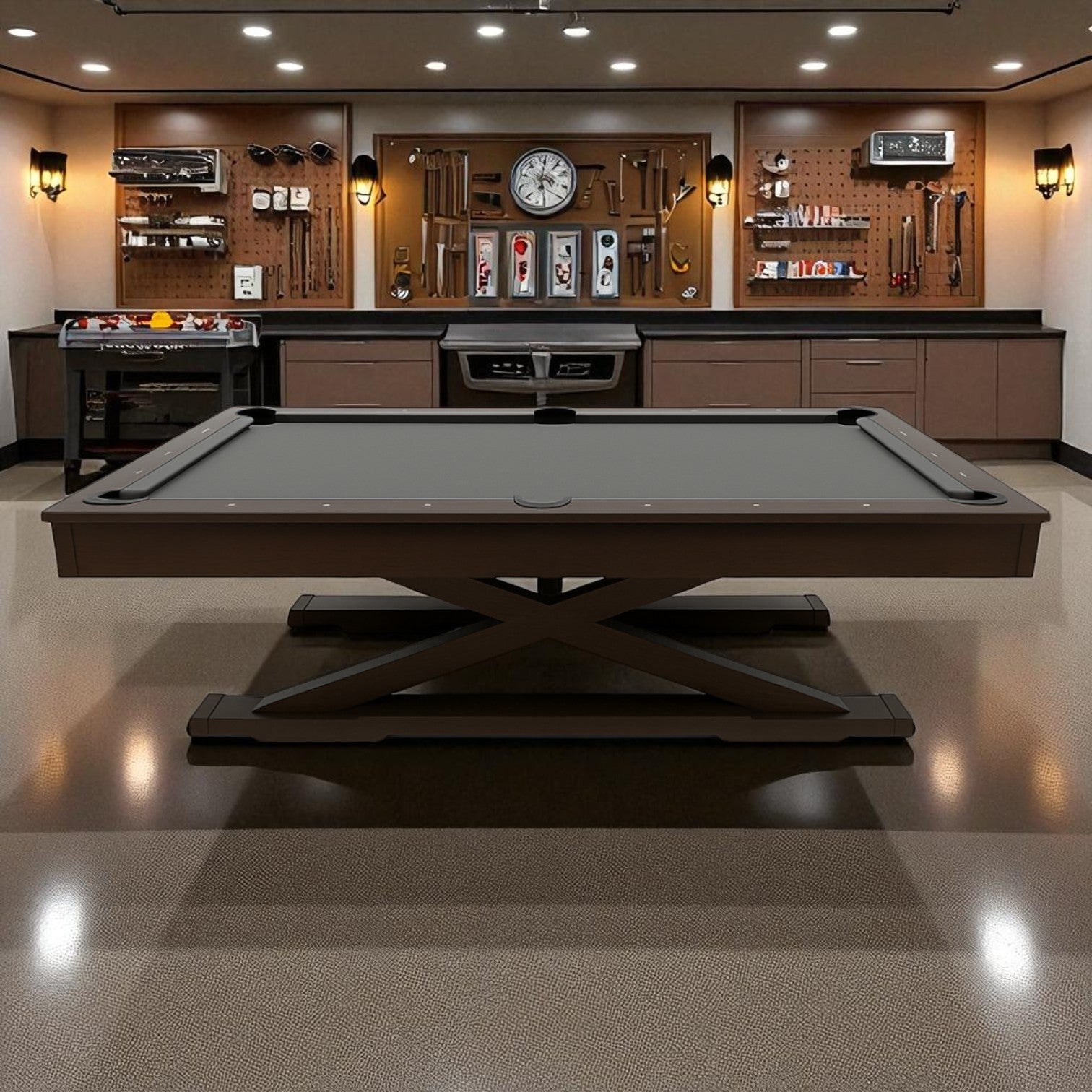 La mesa de billar Oporto es una de nuestras piezas más exclusivas, pensada para quienes aprecian el diseño moderno y contundente. Su base en cruz de acero y su estructura en encino la convierten en una mesa imponente y original, perfecta para espacios con carácter.